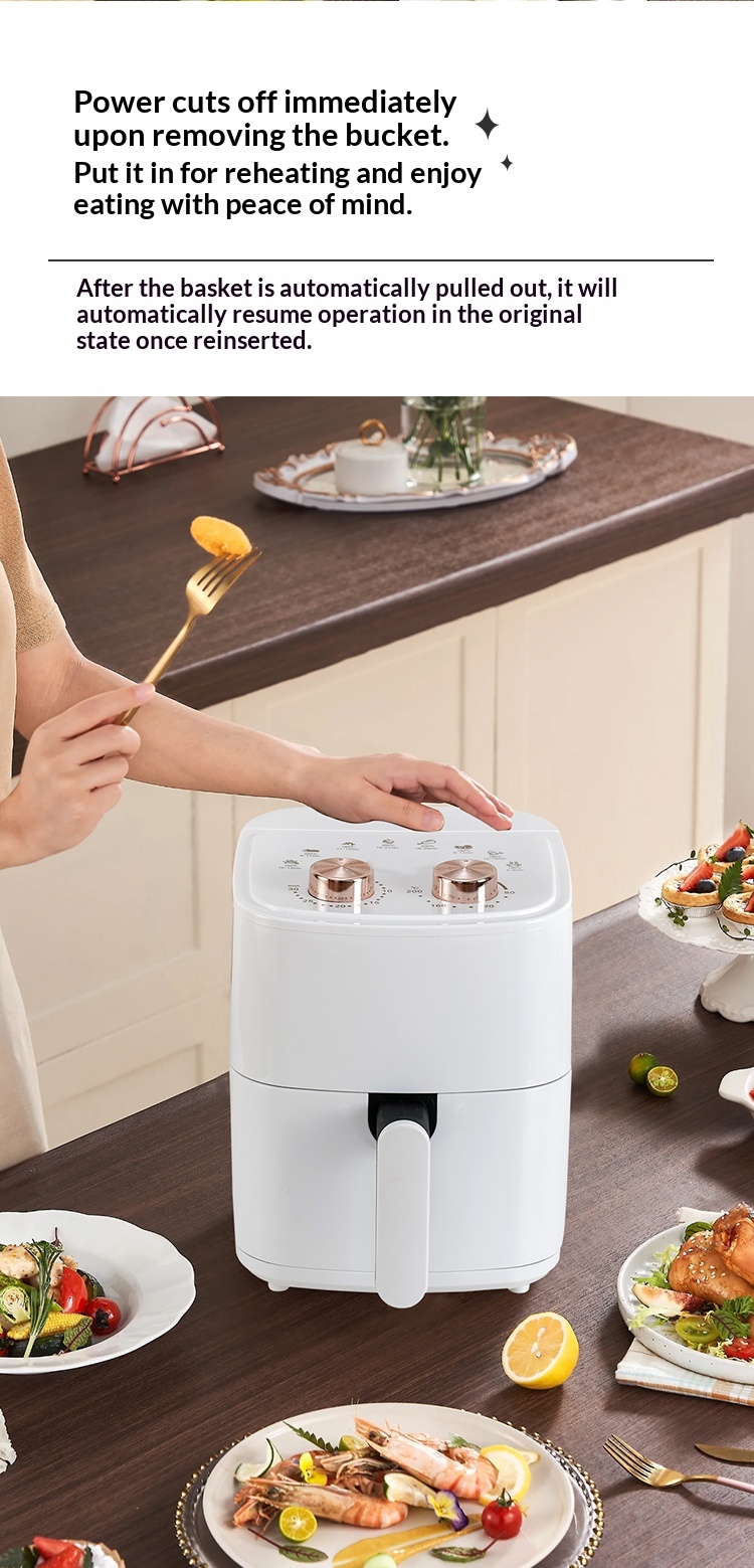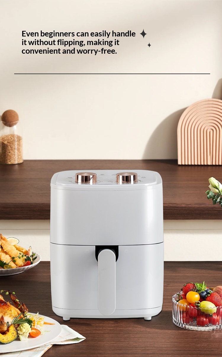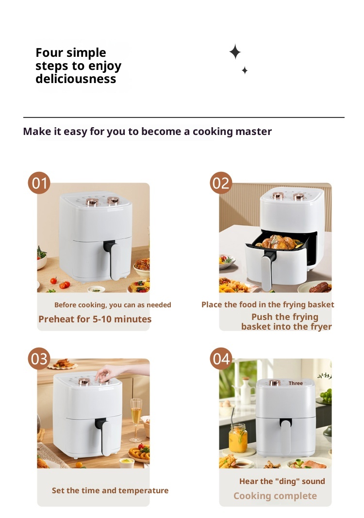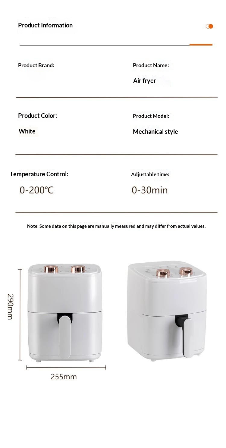 Product information: Color: Dual-knob mechanical design with transparent window Rated power: 1200 Inner pot material: Metal Product dimensions: 255 × 290 Rated voltage: 220 Electric fryer type: Non-visual fryer Valve body material: Metal Capacity: 4–5 L (inclusive)